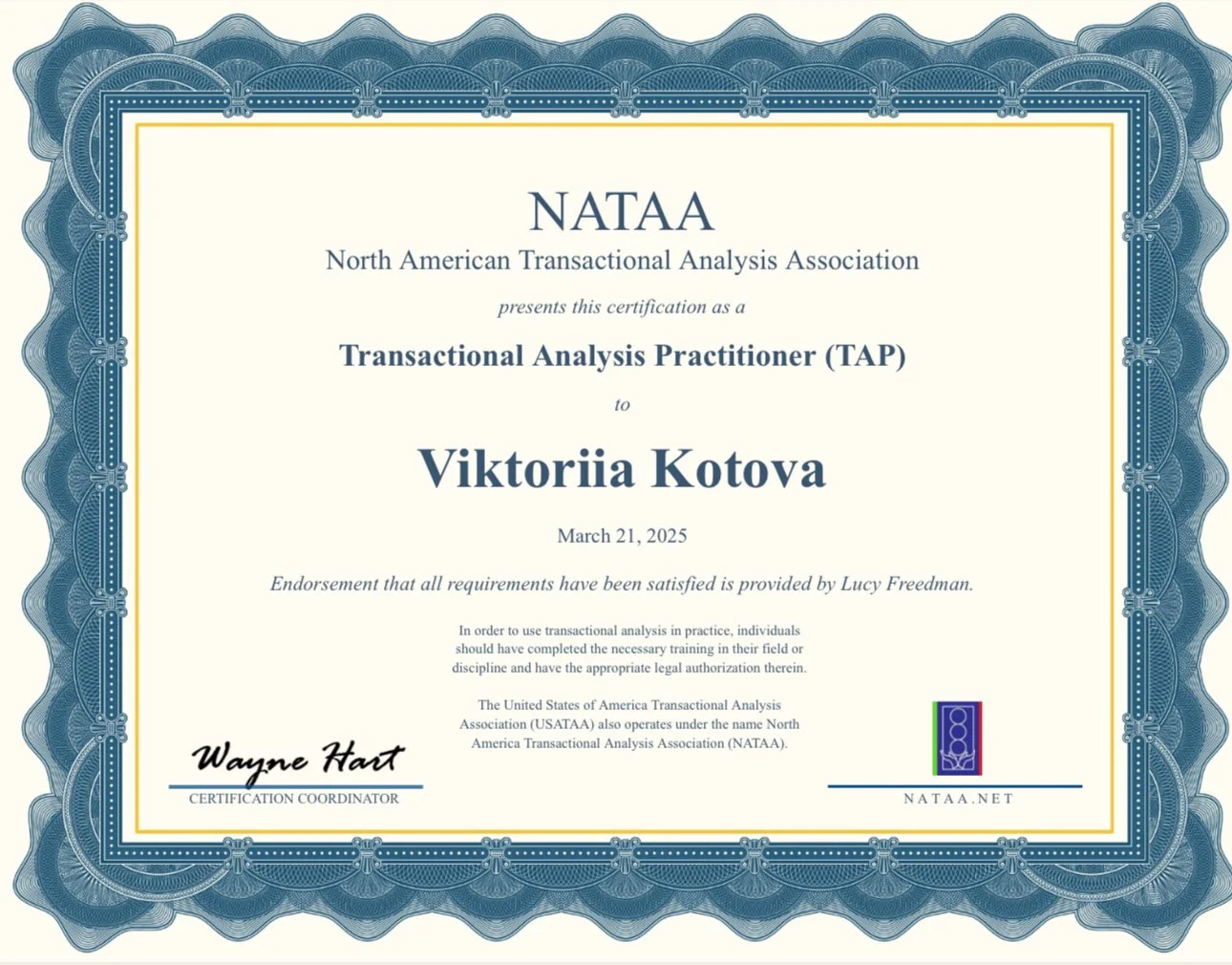 The TAP Certification Training Program was begun by the United States Transactional Analysis Association, now the North America Transactional Analysis Association (NATAA), in order to give recognition to those who are using Transactional Analysis in their work without having to go through the 4-5 years of training that is required to become a Certified Transactional Analyst (CTA) in the International Transactional Association. TAP can be thought of as a preliminary step to CTA for those wanting to pursue that certification or as a stand-alone certification for those who want to be certified as a TA Practitioner.